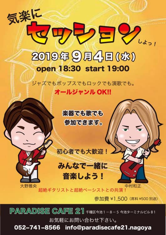 9/4(水)に今池のパラダイスカフェでセッションやります😄