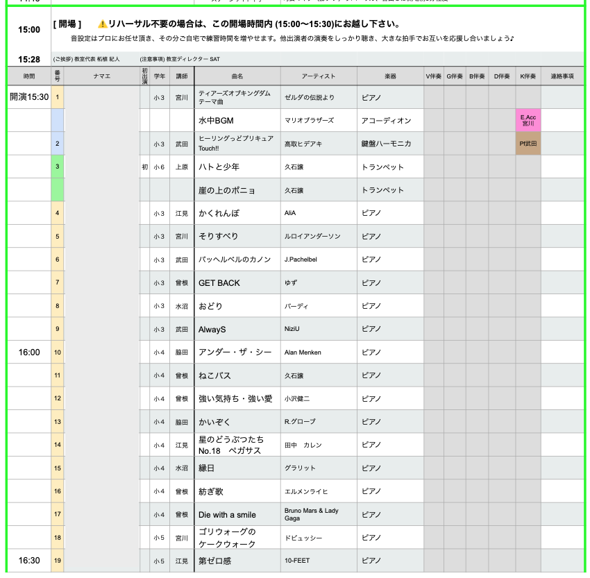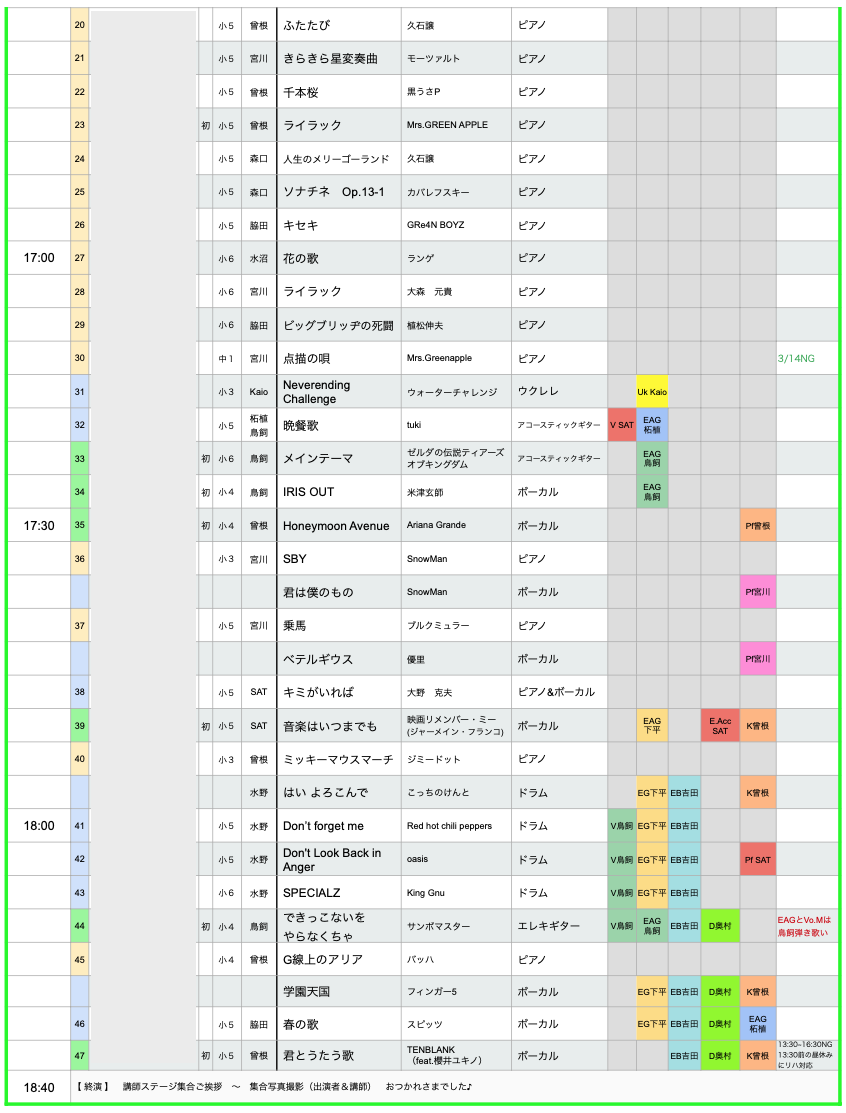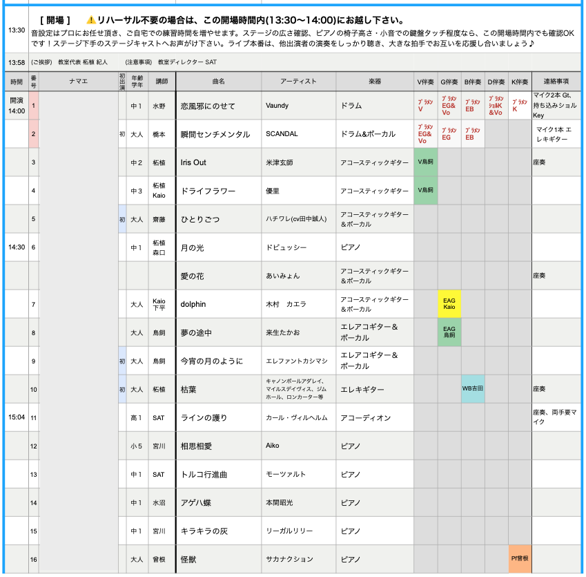 3月14日&15日開催の『スナフキンズ音楽教室 生徒ライブ2026』タイムテーブルが完成しました。